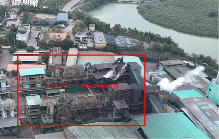 圖2 2023年12月2日,督察組現(xiàn)場督察使用無人機拍攝,盛達化工有限公司使用2條國家明令淘汰的6萬噸/年硫鐵礦制酸裝置生產(chǎn)硫酸